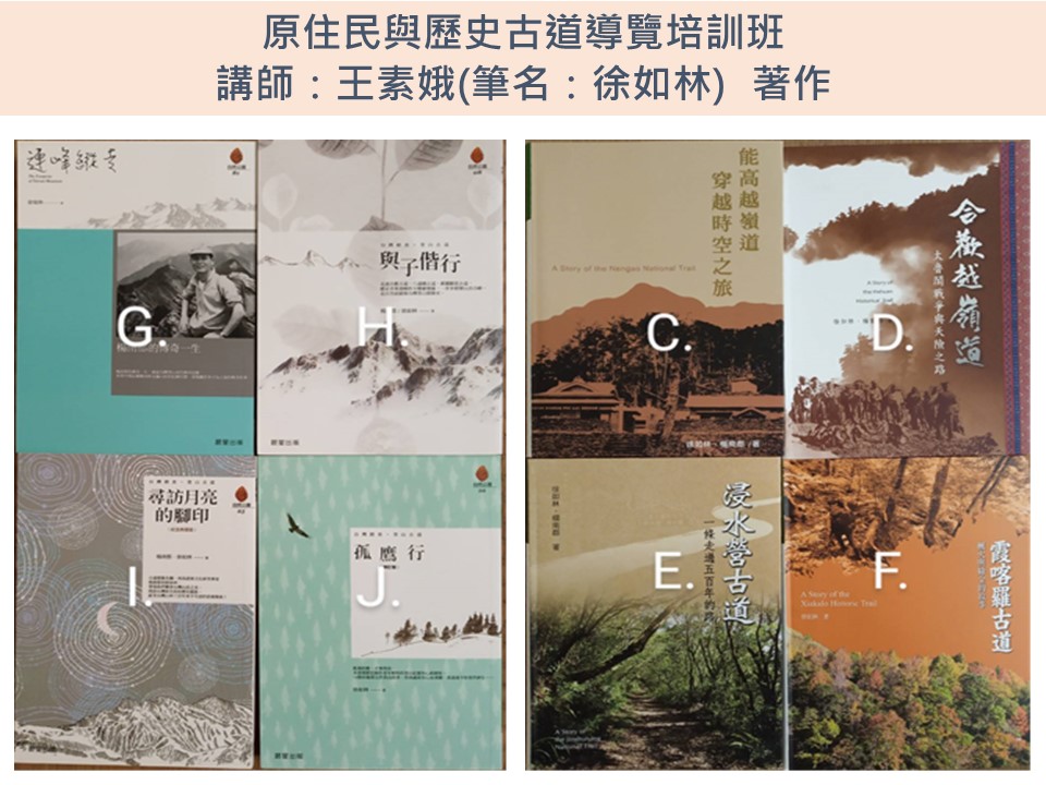 課程報名連結 課程報名連結 分數: 非學分班 師資介紹: 王素娥 老師 學歷:台灣大學 化工系 專長:台灣古道、原住民文化、山林文學 縣 市 別: 臺北市 訓練計畫: 產業人才投資方案 所屬計畫: 產業人才投資計畫 訓練班別: 原住民族與歷史古道導覽培訓班第01期(招生中) 報名繳費方式: 1.報名時應先繳全額訓練費用 [...]